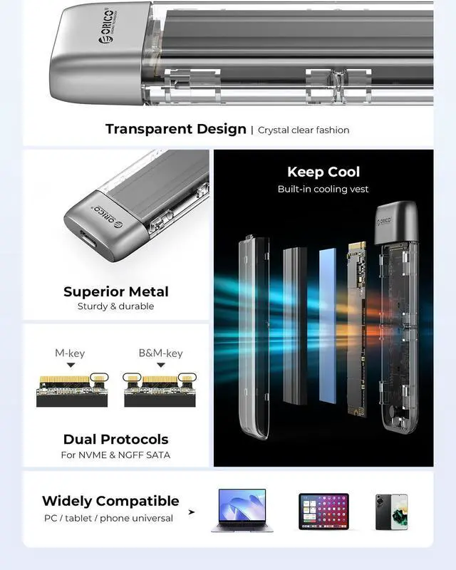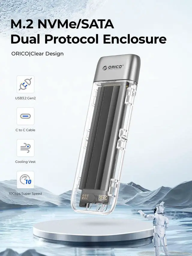 10Gbps/6Gbps High-Speed TransferORICO transparent NVMe enclosure uses the latest USB C 3.2 Gen2 interface with a transfer speed of up to 10Gbps (10Gbps for M. 2 NVME protocol, 6Gbps for SATA protocol)