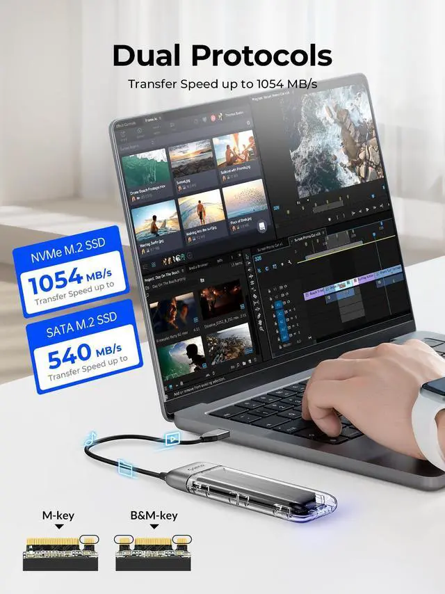 • High-Speed Transfer: Features USB C 3.2 Gen2 interface, supporting transfer speeds up to 10Gbps for NVMe and 6Gbps for SATA protocols.