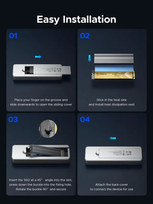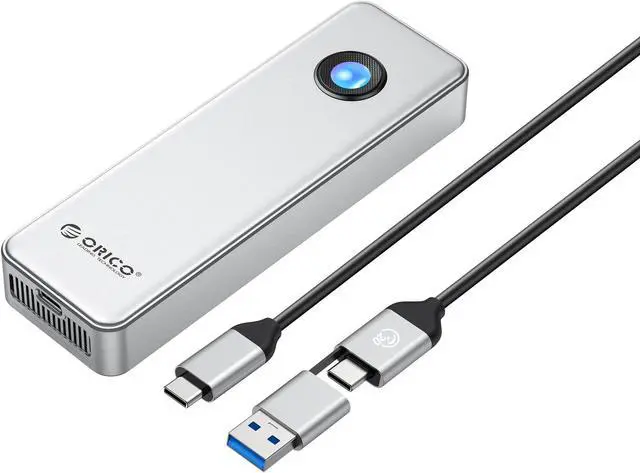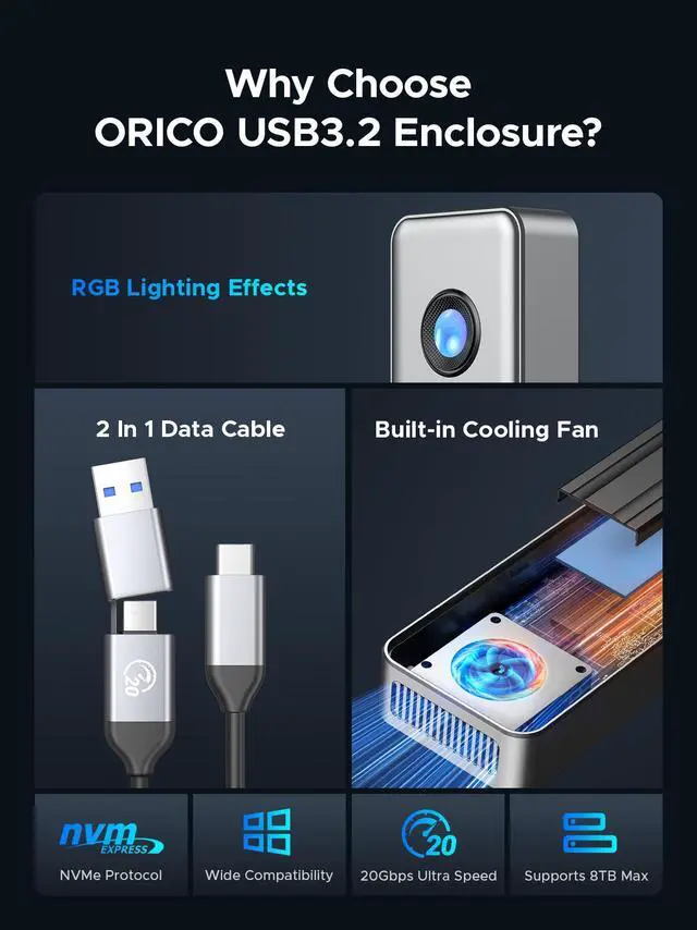 This SSD enclosure combines stylish appearance with excellent performance, featuring a circular RGB light effect that adds a fashionable touch. It also includes a built-in cooling fan and top and bottom heat dissipation grids for comprehensive data protection. Experience convenience and a great user experience whether you are a professional editor or a personal user.