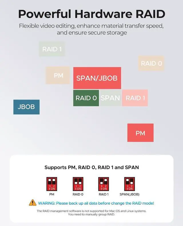 Dual RAID Modes:Experience the flexibility of RAID 0 for lightning-fast data transfers or RAID 1 for reliable data backup.