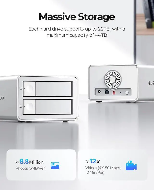 Massive 44TB Storage Expansion:Support up to 22TB per drive, offering a colossal 44TB of external storage.