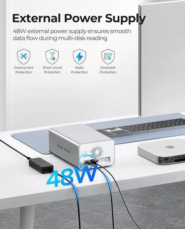 Universal Compatibility:While the 48W power supply ensures stable performance. Expand your storage effortlessly across multiple platforms: Seamlessly integrate with Windows, Mac, and Linux systems.