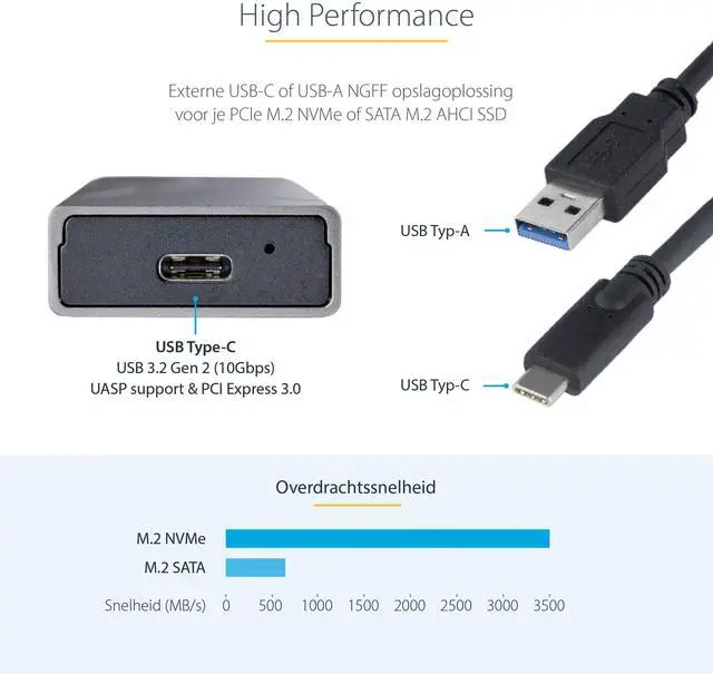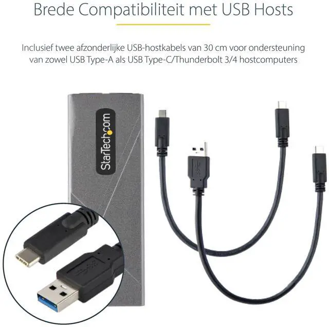 For multiplatform support this enclosure, the enclosure features a USB-C host connection, and includes two different 12 in. (30 cm) host cables, a USB-C to USB-C cable and a USB-C to USB-A cable. This combined with the backward compatibility of the USB protocol, ensures that this M.2 enclosure will work with virtually any computer, whether its USB-A, USB-C or Thunderbolt 3/4.