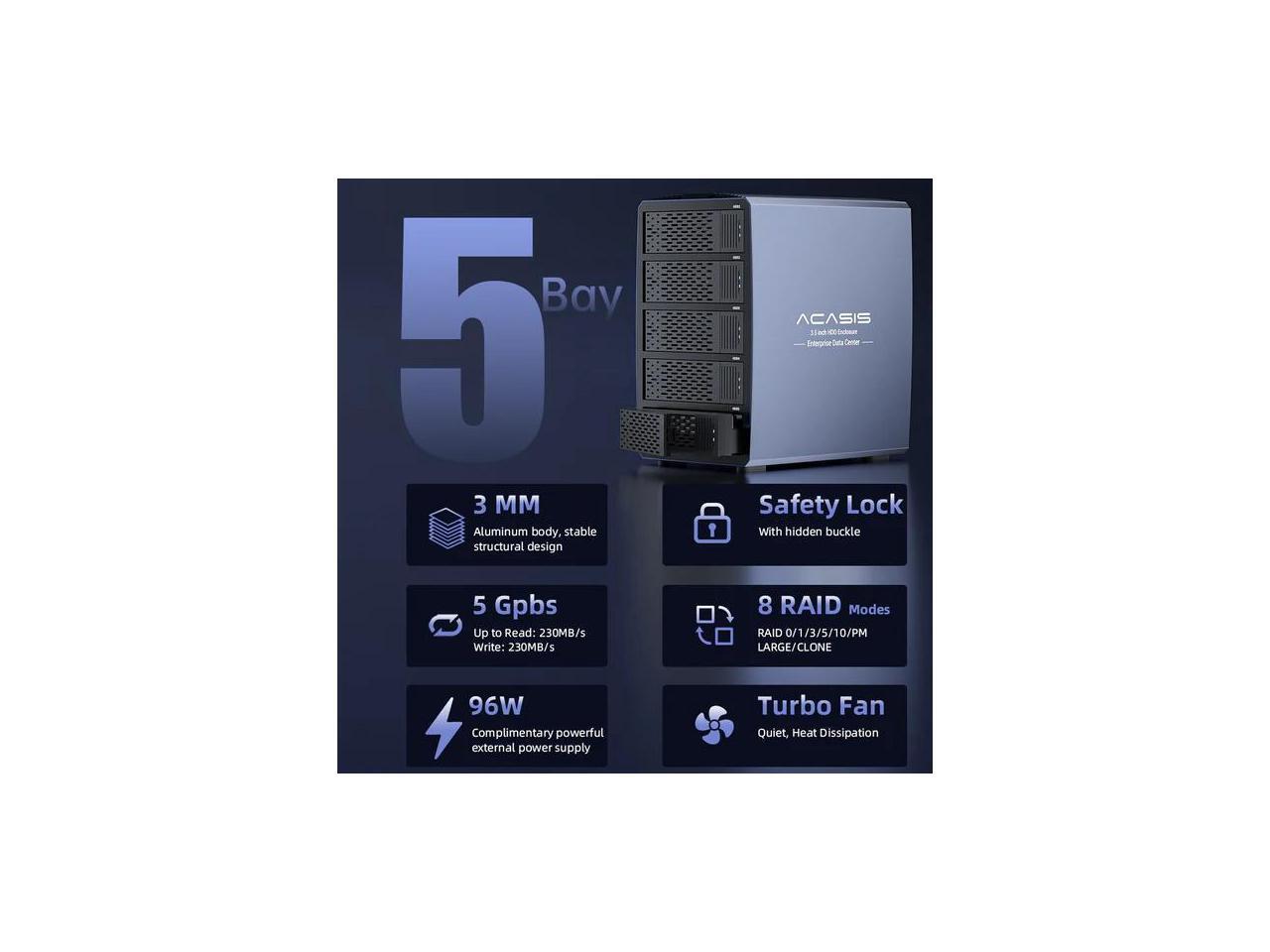 Acasis EC-7355 5 Bay External HDD RAID Case | 2.5/3.5 Inch SATA | 8 RAID Modes | Single Disk 24TB | 96W Power