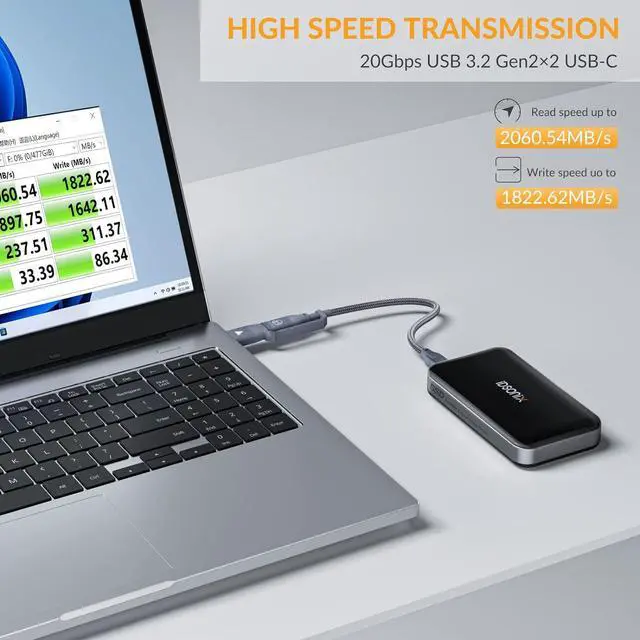 [High Speed Transmission] The 512G external SSD delivers read speeds of up to 2060MB/S, so you can quickly read data anytime, anywhere. USB 3.2 GEN 2×2 up to 20Gbps data transfer, 10 times faster than USB 3.0, support UASP accelerated protocol.