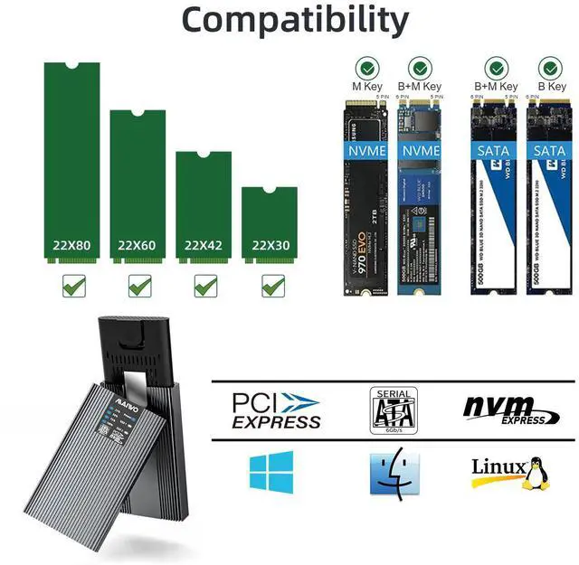 CompatibilityThis dual bay M. 2 SSD cloner supports PCIe NVMe M-Key and SATA B+M Key SSD in size 2230/2242/2260/2280mm