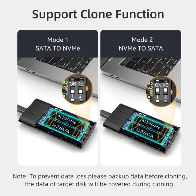 One-Key Offline CloneThis dual bay m. 2 case supports offline clone, no need to connect to any computer, very fast to clone data from NVME to SATA or from SATA to NVME. (Please make Sure the capacity of the target SSD is larger than or equal to the source SSD)