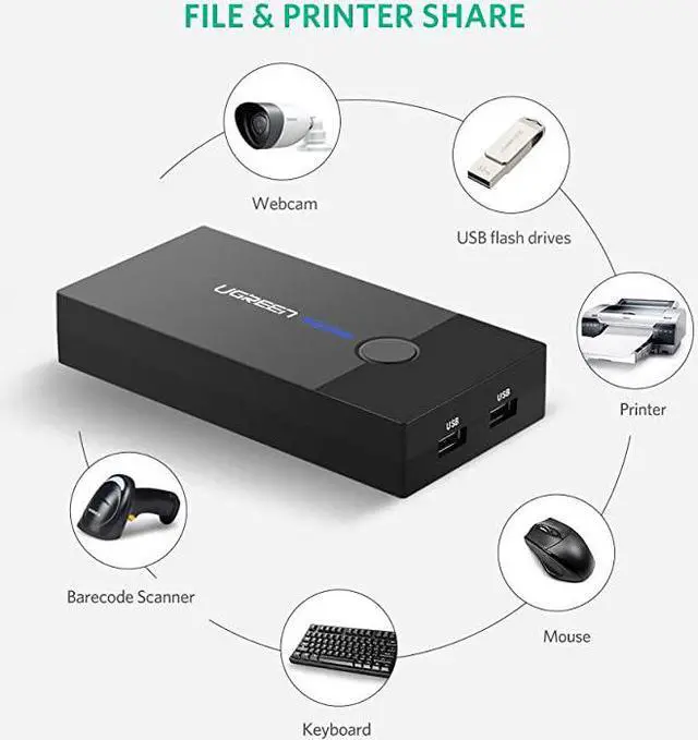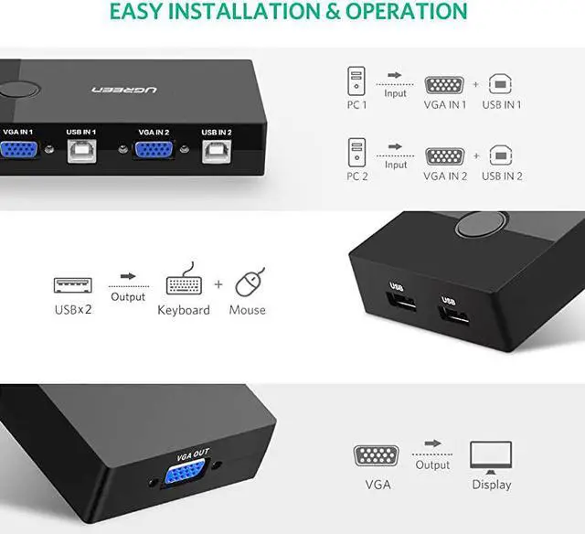 ***** **********Best Quality Guranteed. *****2 Port USB KVM switch box allows you to control 2 computers with only one set of controls (mouse and keyboard). It is great for workstations, test stands or anywhere multitask between computers is required. USB VGA KVM switch provides a cost-effective way to share one USB keyboard, USB mouse, and VGA monitor to control 2 computers. *****Portable and Easy to