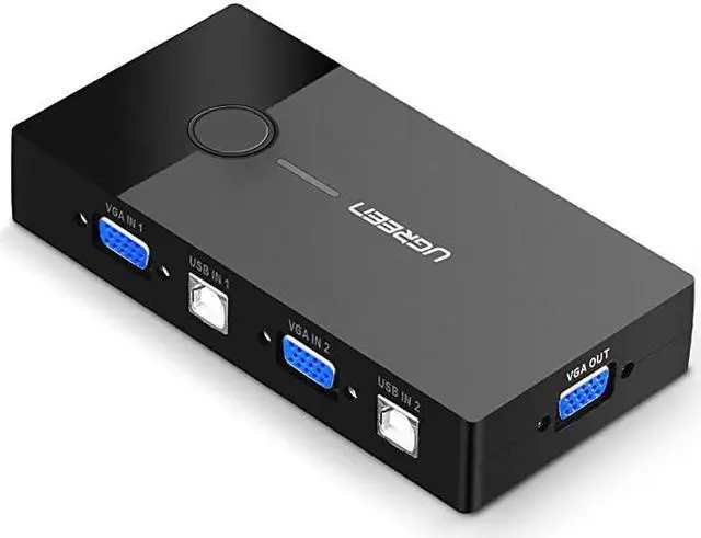 Use: 2 USB Type A connectors, 2 USB Type B connectors, and 3 VGA connectors. The 2 In 1 Out KVM Switch between two computers is controlled by the push button on the top of the unit. 2 USB Type B connectors support not only for data transfer but also for the power supply. No external power required.