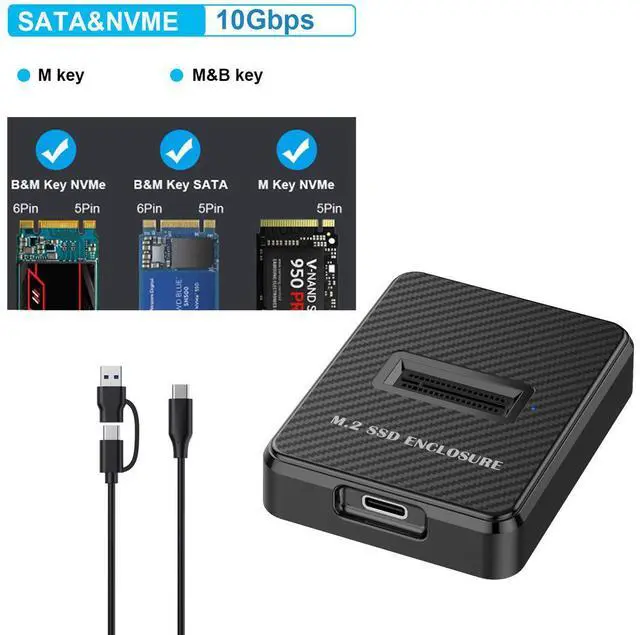 Wide Compatibility: This M.2 to USB adapter supports both SATA/NGFF and NVMe/PCIe SSDs in sizes 2230, 2242, 2260, 2280, and 22110. Compatible with M.2 NVMe (M key) and SATA/PCIe (B&M key) drives.