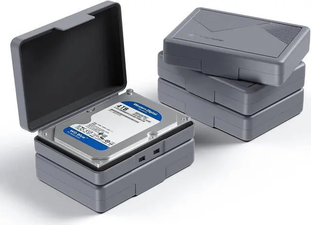 Protective storage case for 3.5 inch hard drives, made of durable plastic to save space by stacking the hard drives.