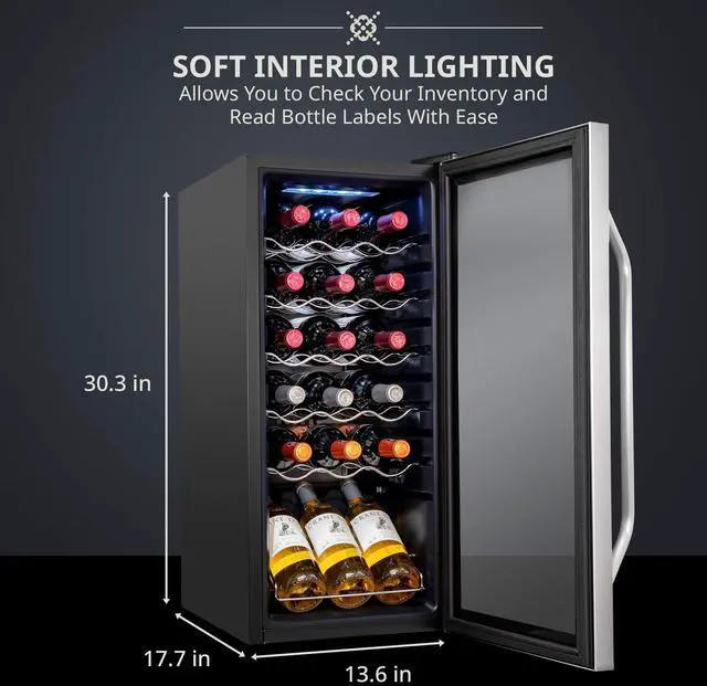 Turn on the energy-efficient LED light to gently illuminate your collection. Say goodbye to harsh fluorescent bulbs that fade labels and affect flavor.