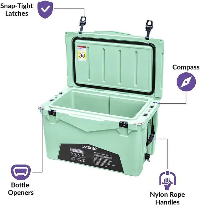 Includes unique and useful features like a leakproof drain plug,, low profile snap tight latches, molded ruler on lid, built in compass, and built in bottle opener. Whether you are heading on an extended camping trip, large beach party or hunting fishing excursion, the Xspec 60 quart cooler is the ultimate companion you want to tag along.