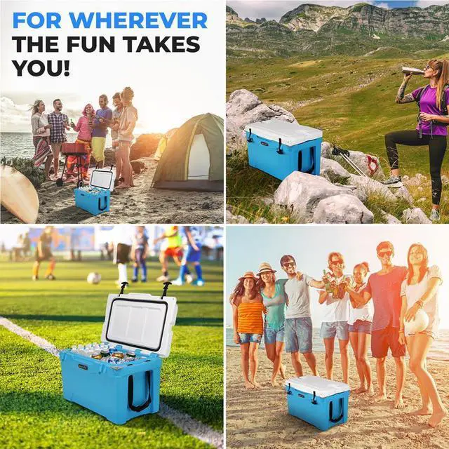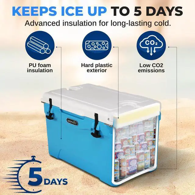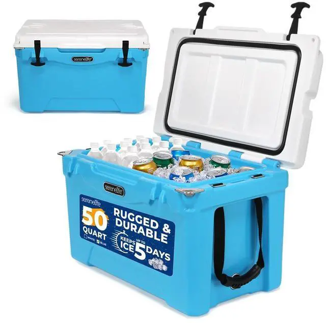 The SereneLife 50-Quart Portable Cooler Box is designed to keep your food and beverages cool for up to 5 days. Whether you're at the beach, a game, or enjoying a picnic, this 50-quart cooler holds 63 cans and even allows 2-liter bottles to stand upright. Constructed with Thermomize insulation and low CO2 foam for reduced environmental impact, it boasts a durable hard plastic exterior, a hinged lid, and 2-way handles for easy transportation. The cooler features a leak-resistant drain, keeping your contents fresh and cold even in warmer temperatures (up to 90 °F).