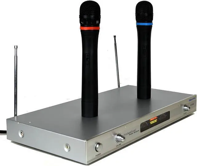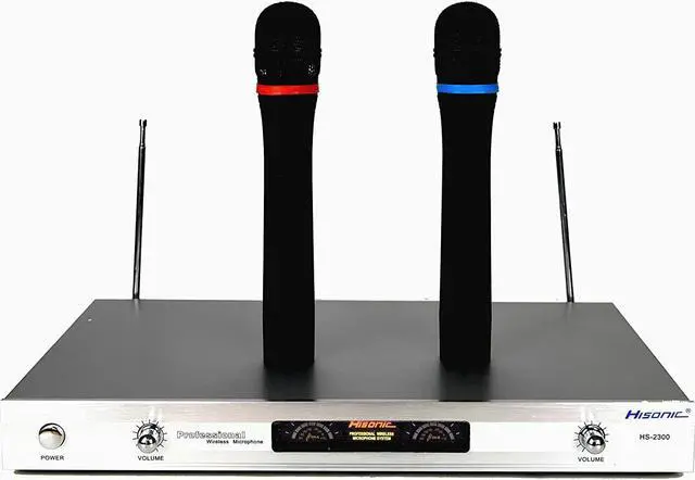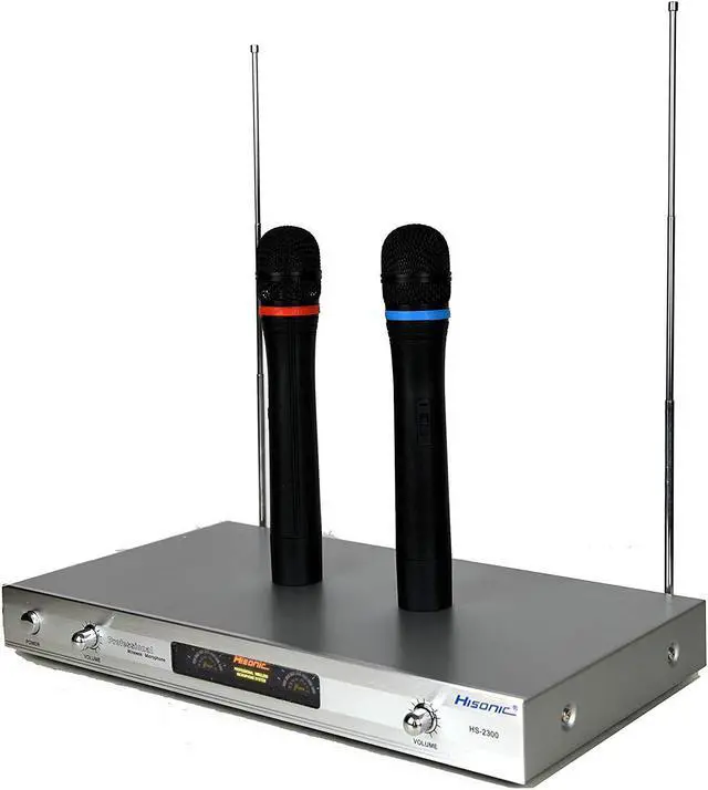 This easy-to-use and affordable dual wireless microphone starter set from Hisonic includes two handheld wireless microphones and a wireless FM receiver, giving you the range and enhanced mobility you need (around 30 meters in good position!).