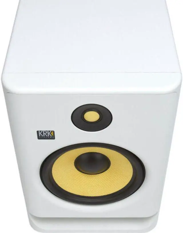 KRK ROKIT 7 G4 White Noise, a scientifically designed speaker with a front-firing port that offers low-end extension, punch, and flexible room positioning, well suited for professional studios, broadcast TV, and mixing applications.