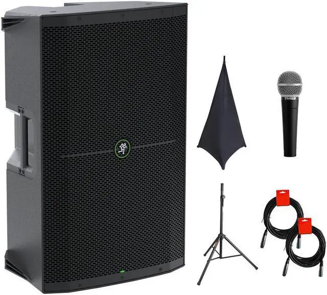 Looking for a portable and versatile active speaker for live sound applications? Then look no further than the Mackie Thump215 15" Powered PA Loudspeaker System, a powerful PA speaker that includes a 2-channel mixer, great for small club/band PA systems, singer/songwriters, boardrooms, A/V presentations, classrooms, or as a personal monitor for practice or performance. The Thump215's mixer features two combo XLR-1/4" mic/line channels with dedicated gain controls, while an XLR output is provided for daisy-chaining additional speakers. A 3.5mm TRS aux input is also available on channel 2 for connecting your favorite portable player. The tough, impact-resistant polypropylene enclosure ensures protection from on-the-road wear and tear. The bottom of the cabinet provides a pole cup for mounting on a speaker pole or stand. With black SSA100 Speaker/Lighting Stand Skirt gives your speaker or lighting stand a clean and elegant look, well suited for weddings, corporate events, and other productions where an upscale aesthetic is desired. Plus an Auray Deluxe Height-Adjustable Steel Speaker Stand, Superlux TM58 Dynamic Vocal Microphone, and two extra XLR-XLR cables.