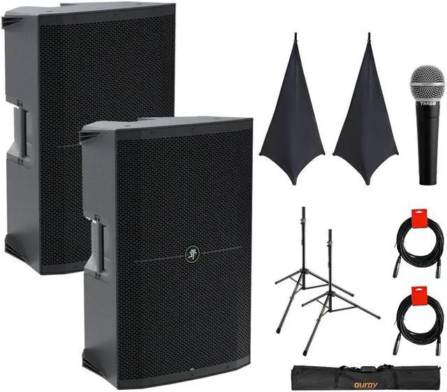 Looking for a portable and versatile active speaker for live sound applications? Then look no further than the Mackie Thump215 15" Powered PA Loudspeaker System, a powerful PA speaker that includes a 2-channel mixer, great for small club/band PA systems, singer/songwriters, boardrooms, A/V presentations, classrooms, or as a personal monitor for practice or performance. The Thump215's mixer features two combo XLR-1/4" mic/line channels with dedicated gain controls, while an XLR output is provided for daisy-chaining additional speakers. A 3.5mm TRS aux input is also available on channel 2 for connecting your favorite portable player. The tough, impact-resistant polypropylene enclosure ensures protection from on-the-road wear and tear. The bottom of the cabinet provides a pole cup for mounting on a speaker pole or stand. With two black SSA100 Speaker/Lighting Stand Skirt gives your speaker or lighting stand a clean and elegant look, well suited for weddings, corporate events, and other productions where an upscale aesthetic is desired. Plus a SS-47S-PB, which comprise a pair of steel speaker stands and an included carrying bag. Each stand is suitable for portable and full-sized PA speakers weighing up to 120 lb., Plus an Auray Deluxe Height-Adjustable Steel Speaker Stand, Superlux TM58 Dynamic Vocal Microphone, and two extra XLR-XLR cables.
