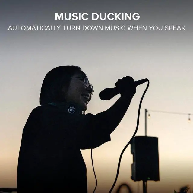 Youve got music playing nice and loud but, its time for another announcement. Sure, you could mess with your levels every time, but whos got time for that? Simply press the Music Ducking button, and channel 2 will automatically turn down whenever you speak into the mic on channel 1.
