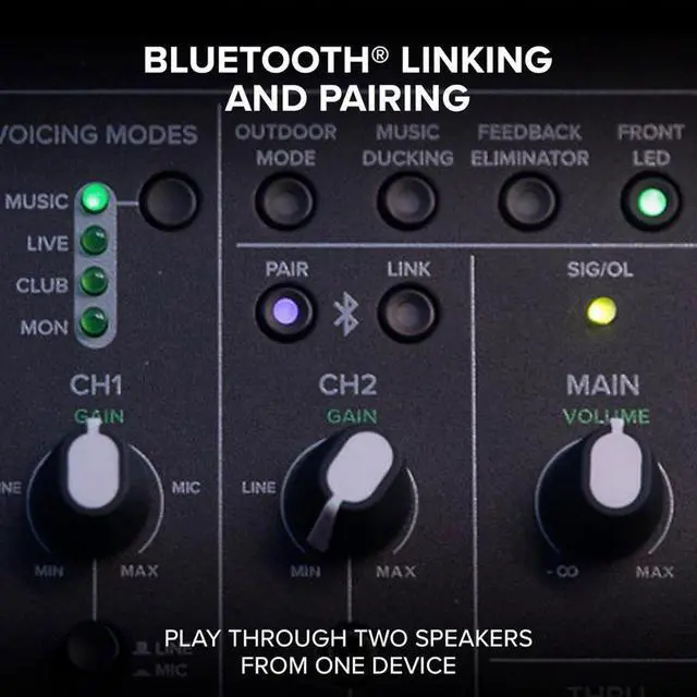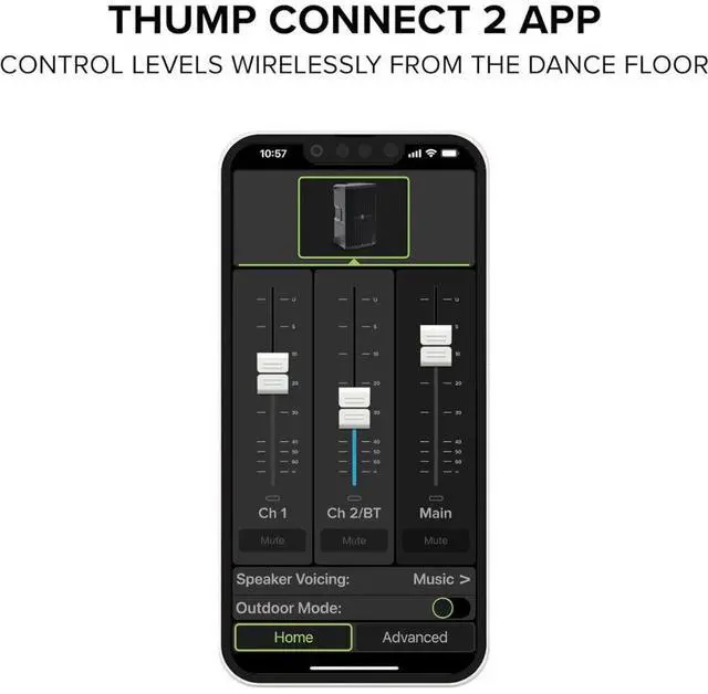 Stream music wirelessly to Thump210XT via Bluetooth® so you can hear your mix from anywhere on the floor. Dive into the Thump Connect 2 App to link two speakers wirelessly, plus adjust anything from system EQ and voicing modes to channel levels and application-specific presets, all in the app.