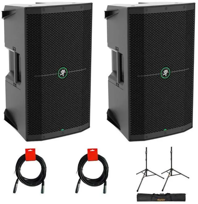 Mackie Thump210 is a compact 10 1400W powered loudspeaker featuring proven sound quality, Feedback Eliminator and Music Ducking mode. Connect to the built-in 2-channel mixer with XLR/TRS combo and stereo 1/8" aux connections, and enjoy powerful amplification via the 1 compression driver and 10" high-performance woofer. Bundle with XLR- XLR Cable (2 Pack), Auray SS-47S-PB Deluxe Height-Adjustable Steel Speaker Stands with Tripod Base and Carrying Case