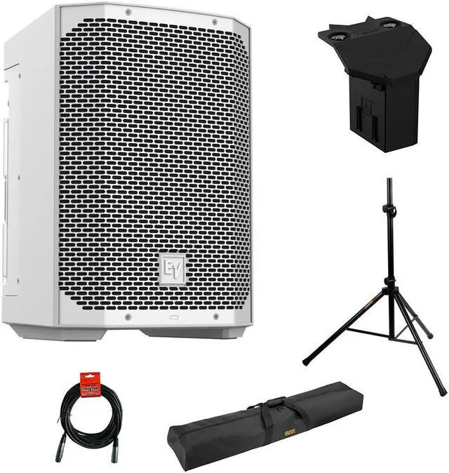 Electro-Voice EVERSE 8 is a weatherized, battery-powered loudspeaker that features Bluetooth audio and control. With an IP43 rating, the EVERSE 8 is ready to play, rain or shine. The speaker provides 400W of power, doing so in a relatively lightweight, 16.8 lb package. With its 8" woofer and 1" titanium tweeter, the speaker delivers between 65 Hz to 18 kHz (-3 dB) at a maximum SPL of 121 dB. On the rear, you'll find a pair of combo XLR-1/4" inputs for microphone or line-level signals as well as a 3.5mm aux input. A Bluetooth receiver allows you to stream audio from your favorite portable device. A free Bluetooth app provides wireless access to factory voicings, compression, EQ, and effects, allowing you to dial in your best sound from anywhere in the room. Pole-mount it into a subwoofer or speaker stand for a DJ set or lay it horizontal on the floor of a stage, where it can serve as a wedge for musicians as they perform. It also can be used as a kickback monitor for added versatility. Bundle with Auray SS-4420 Steel Speaker Stand, Auray Speaker Stand Bag 51" Interior (Black), Electro-Voice EVERSE 8 Battery Pack and XLR- XLR Cable.
