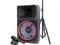 Gemini GSP-L2200PK, a 2200W powered Bluetooth PA speaker with sound reactive LED lighting that includes a speaker stand and a microphone with a cable well suited for events, speaking engagements, fitness programs, DJ parties, and high-stakes karaoke competitions. The rugged enclosure features a telescopic handle and two low-profile wheels for ease in transport.