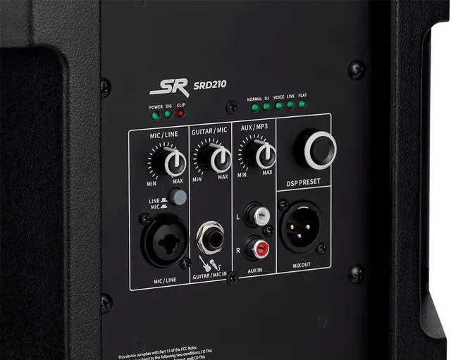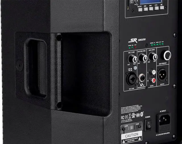This wireless functionality allows you to effortlessly connect your compatible devices and stream music or other audio content directly to the speakers. Whether you're a DJ looking to mix tracks or simply want to play your favorite tunes, the Bluetooth streaming feature adds versatility and ease of use to your sound system. The SRD210 speaker comes equipped with a variety of input options to accommodate different audio sources. It includes one combo XLR/TRS mic/line input, perfect for connecting microphones or instruments, one 1/4" guitar/mic input for added flexibility, and one stereo RCA line input for connecting external devices such as mixers or media players.