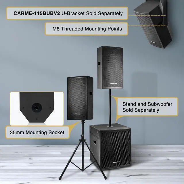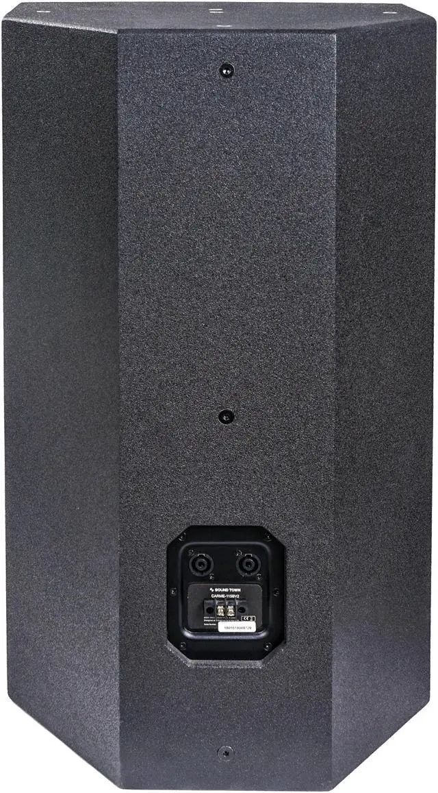 The CARME-115BV2 speaker is equipped with two speakon connectors and one barrier strip. It also has a 1 3/8" (35mm) tripod speaker stand mount on the bottom and M8 threaded mounting points for suspended installation, which makes it versatile for both indoors and outdoors. With rugged birch plywood construction and black textured paint, the Sound Town CARME-115BV2 speaker provides stellar sound and performance without sacrificing durability. A recessed handle on the top of the enclosure makes it easy to transport. Whether you use it in courtyards, meeting rooms, schools, churches, or if you are in a band or running any music gigs, this speaker can be relied on for quality sound and consistent performance.