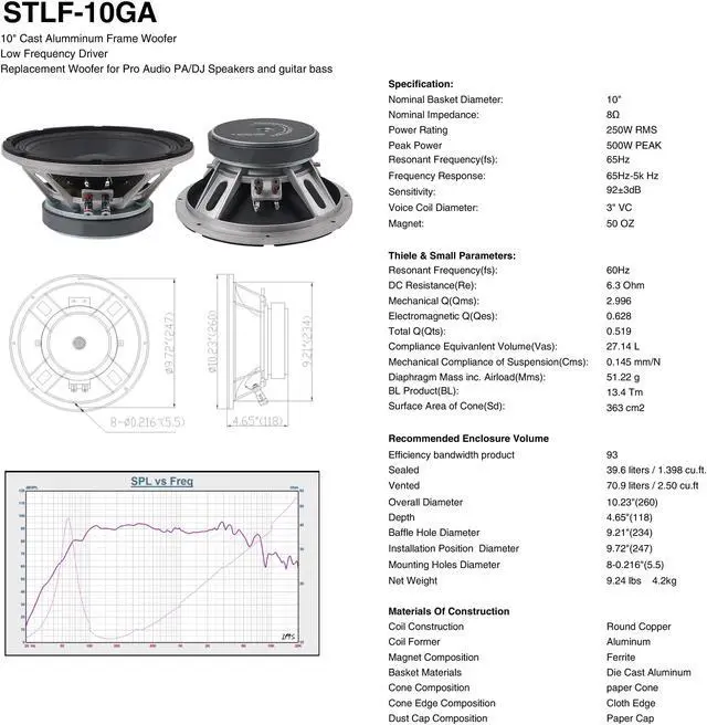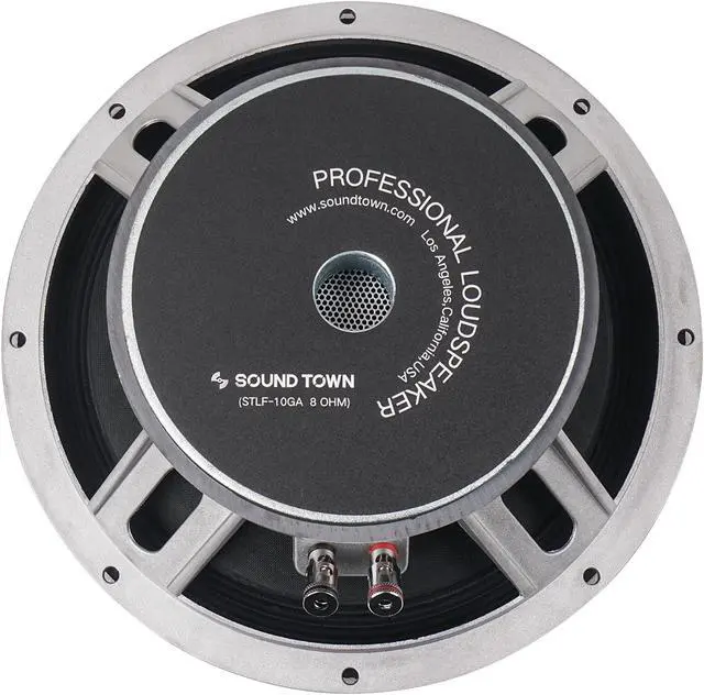 The Sound Town STLF-10GA-PAIR includes two STLF-10GA woofers. The STLF-10GA is a 10" universal replacement woofer for PA/DJ speakers and bass guitar cabinets; it is compatible with the Sound Town PA speakers and speakers of other brands which need a 10" low-frequency driver. The woofer comes with 8-ohm impedance and has a frequency range of 65 Hz - 5 kHz. It is built in a cast aluminum chassis and has a paper cone with cloth edge. With 250W RMS, 500W peak power handling capability, the STLF-10GA delivers massive and deep bass and makes a great replacement woofer for your 10-inch PA speakers or bass guitar cabinets.
