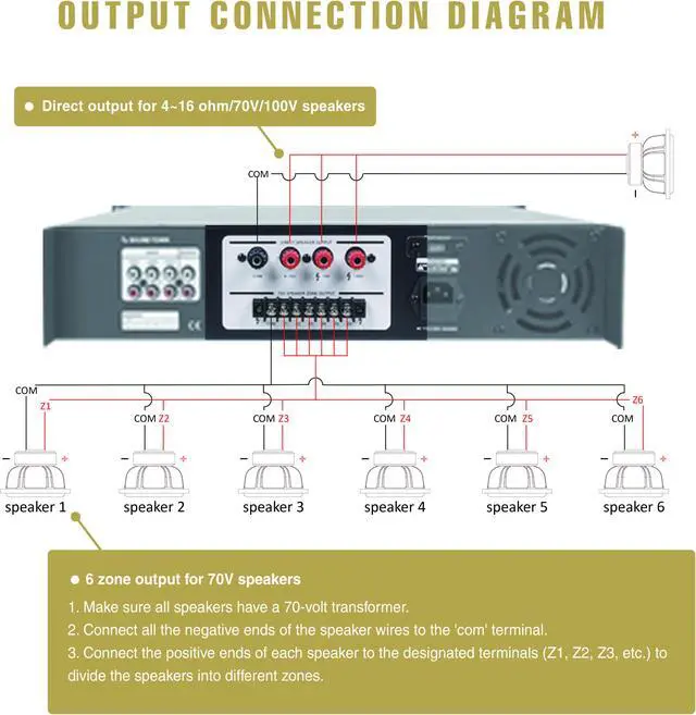 The multi-zone power amplifier comes with 3 sets of RCA inputs, 2 mic inputs, and Bluetooth, USB, FM radio and RCA line output, 70V / 100V / 4~16-ohm red positive speaker output terminals and shared negative speaker output terminal. Its versatile input and output options allows you to easily set this up in a variety of multi-room applications. Each of the 2 mics input has echo control all 6 zones have separate volume knobs for easy adjustment.