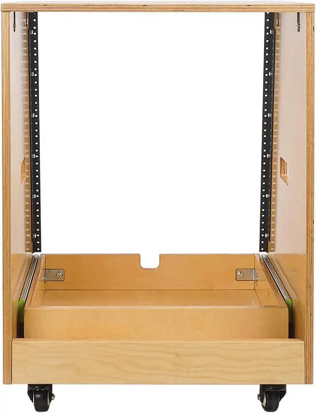 On top of the 12U rack space, an additional 2U slide out drawer at the bottom provides perfect storage room for a drum machine, laptop or turntable. Rail screws are included in the package, as well as rubber feet on the bottom to keep the desk from slipping. There are also four rubberized casters, two of which come equipped with lever brakes. Once assembled, the case can be moved around easily.