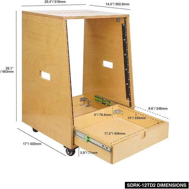 Sound Town 12U DIY Slanted Studio Rack with 12U Rack Space, Extra 2U Drawer, Plywood, Rubber Feet, Casters, Golden Oak (SDRK-12TD2)