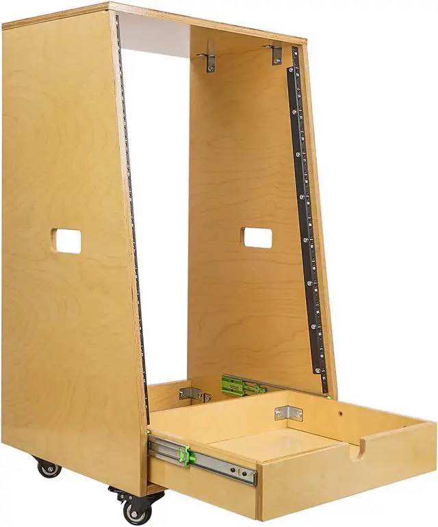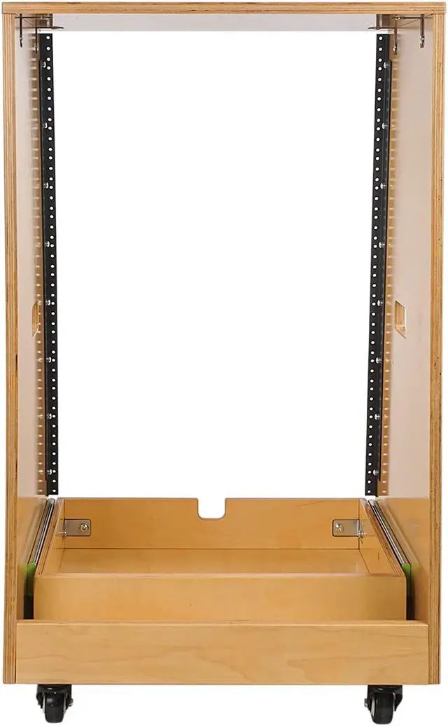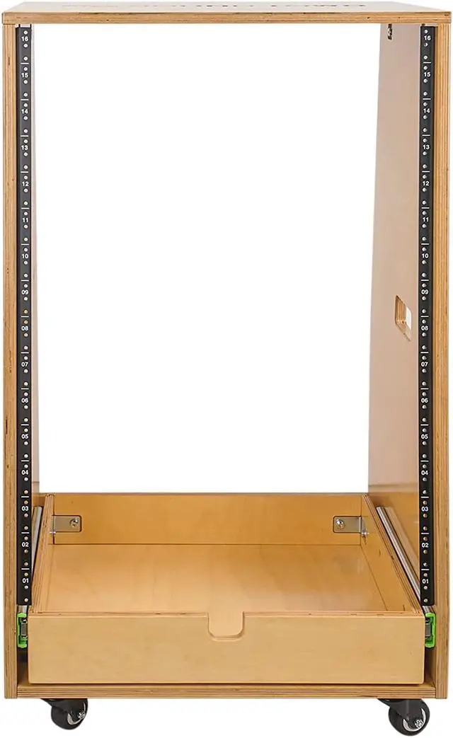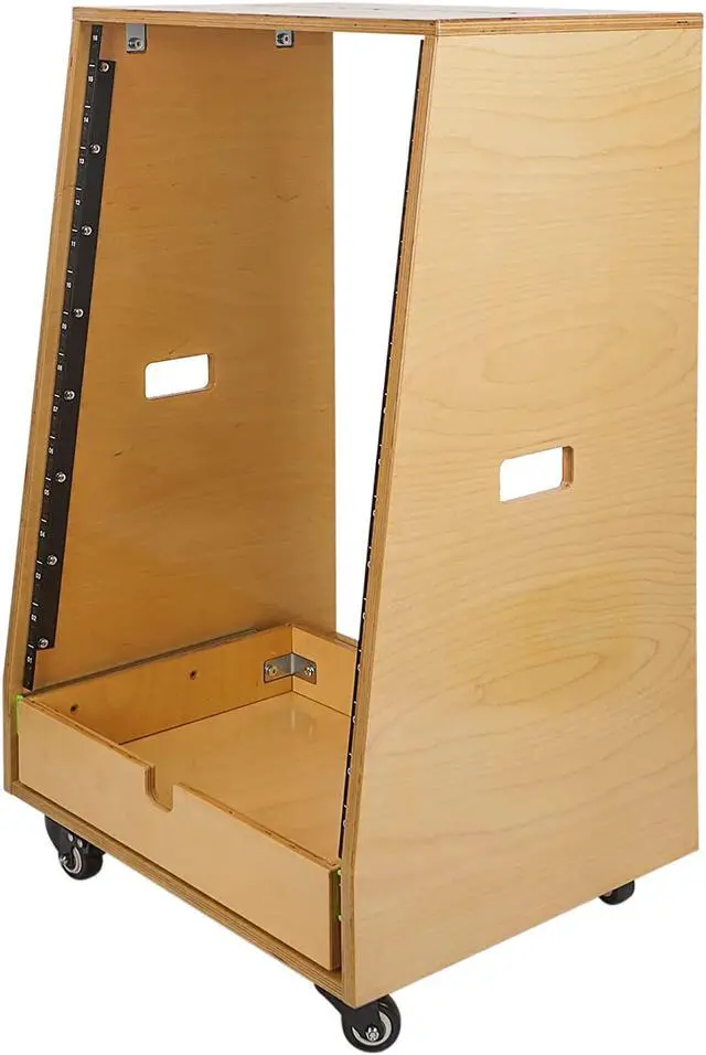 On top of the 16U rack space, an additional 2U slide out drawer at the bottom provides perfect storage room for a drum machine, laptop or turntable. Rail screws are included in the package, as well as rubber feet on the bottom to keep the desk from slipping. There are also four rubberized casters, two of which come equipped with lever brakes. Once assembled, the case can be moved around easily.