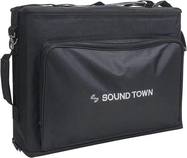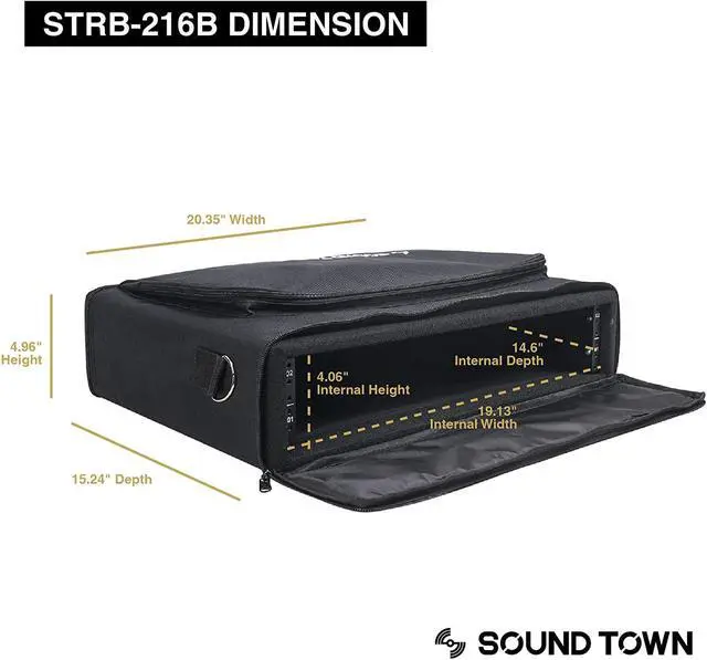 The Sound Town STRB-216B is a portable 2U rack bag with 14.6“ rack depth and 19” width. It is constructed of plywood rack frame, covered by padded 800-denier nylon and provides great protection for your gears. The STRB-216B is a lightweight solution for professional musicians and is ideal for rack mounting wireless microphone systems, preamplifiers, processors and etc.
