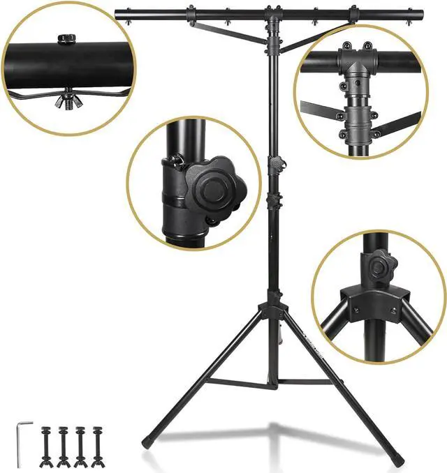 The Sound Town STLS-T09-PAIR lighting stands are a versatile and portable solution for your lighting needs. It features 2 STLS-T09 lighting stands, each with a T-bar with a tripod base, providing stable support for various lighting setups. These stands are made from sturdy steel, ensuring durability and reliability. The T-bar extends 3.7 feet and includes hanging bolts, capable of holding up to four par cans.
