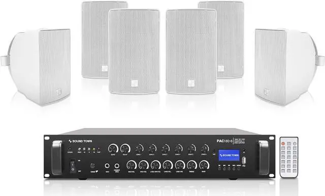 SUITABLE FOR MANY APPLICATIONS: Whether its for indoor or outdoor use, at home or in a commercial building, the Sound Town PAC180X6TV6W surface-mount speaker and amplifier bundle has you covered. It is ideal for multi-room applications such as restaurants, lounges, bars, schools, warehouses, and so much more