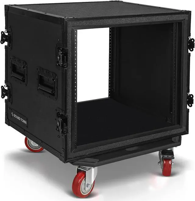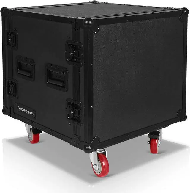 Sound Town Black Series Shock Mount 10U ATA Plywood Rack Case with 21" Rackable Depth, All-Black Anodized Hardware and Casters, Pro Tour Grade (STRC-SPB10UW)