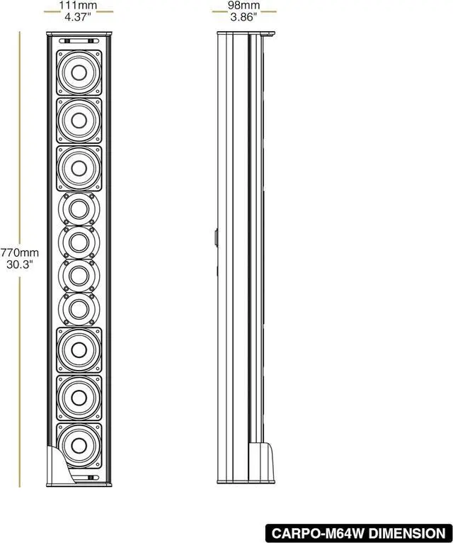 The CARPO-M64W is equipped with 6 x 3" woofers, 4 x 1.2" dome tweeters, and a low-inductance passive crossover. It can handle 200W RMS and 400W program power output at 8-ohm, delivering balanced and crisp audio throughout any small to medium-sized venues.