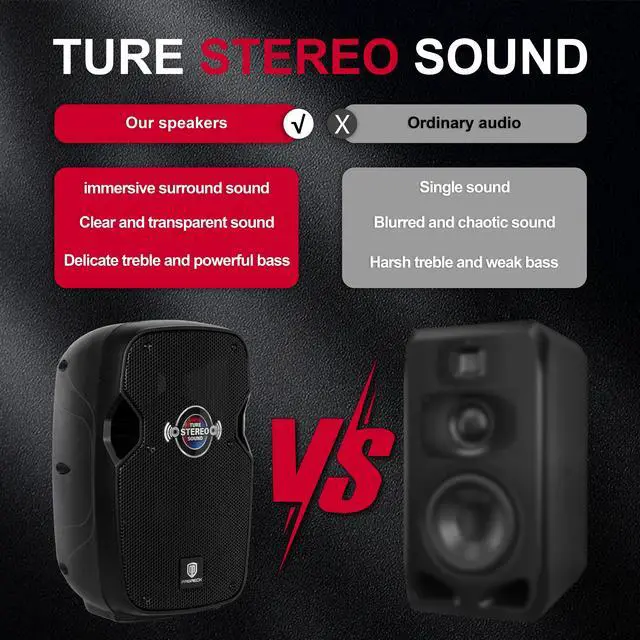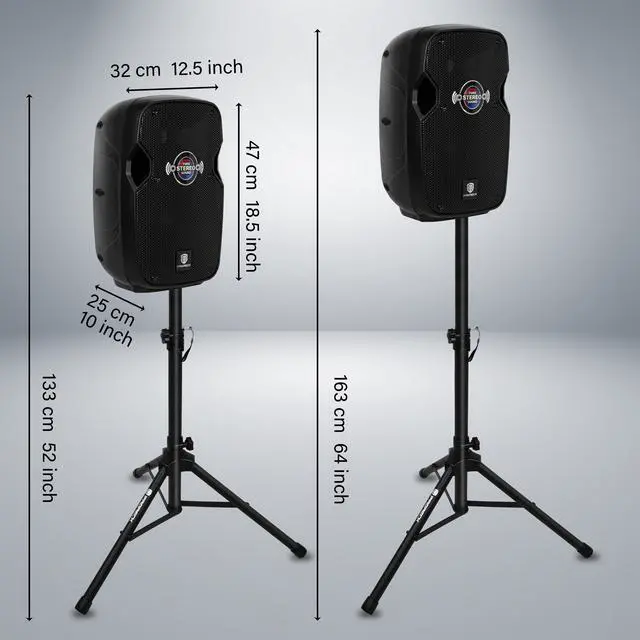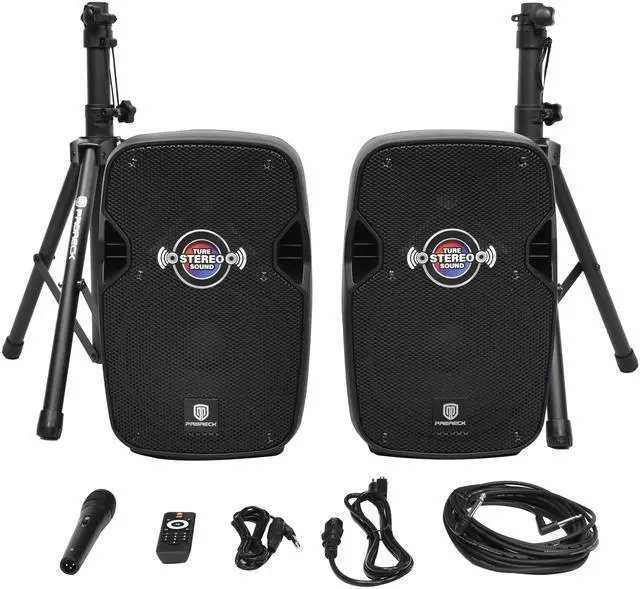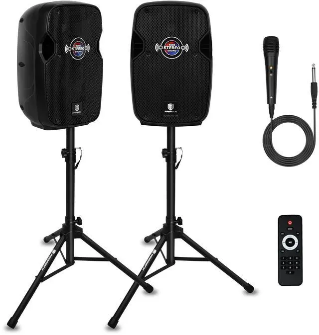 Complete Performance Package: INCLUDES: (1) Active speaker, (1) Passive speaker, (1) Wired mic, (2) Adjustable speaker stands, (1) 10FT 1/4inch cable, (1) Power cord, (1) Remote control. Ready-to-use for karaoke, DJ gigs, speeches, and live performances.