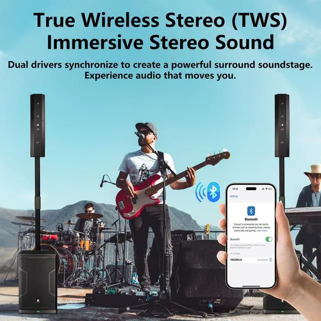 TRUE WIRELESS STEREO (TWS) PAIRING Pair two PRORECK 900EX speakers wirelessly via TWS mode for a true stereo experience. Simply press and hold the Bluetooth button on the master unit for 3 secondsthe TWS logo turns red, instantly creating a powerful left-right stereo setup without messy cables.