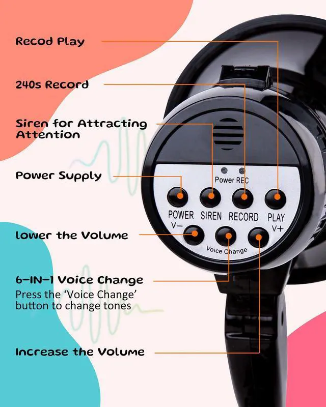 Voice Changer: There are 6 different sound effects: Child, Alien, Female, Robot, Spookey, Monster. Using this megaphone bullhorn with voice changer mode at a party, holiday, game can make fun of your friends, families and increase the joy of life