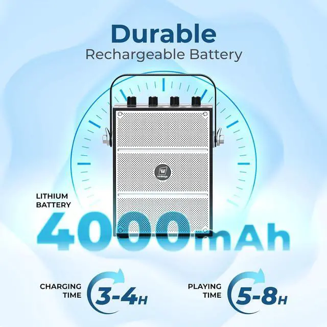 2. Designed for Multifunctionality and Extended Playtime: Tailored to meet diverse playback needs, this speaker with microphone supports Bluetooth connectivity, USB, TF card, Aux input, and an echo function for enhanced audio experiences. It features both 3.5mm and 6.35mm microphone jacks compatible with wired microphones, as well as dedicated guitar ports. Equipped with Type-C fast charging technology, the speaker provides up to 5 hours of continuous playback on a single charge, ideal for churches, small gatherings, schools, classrooms, gyms, corporate meetings, and presentations