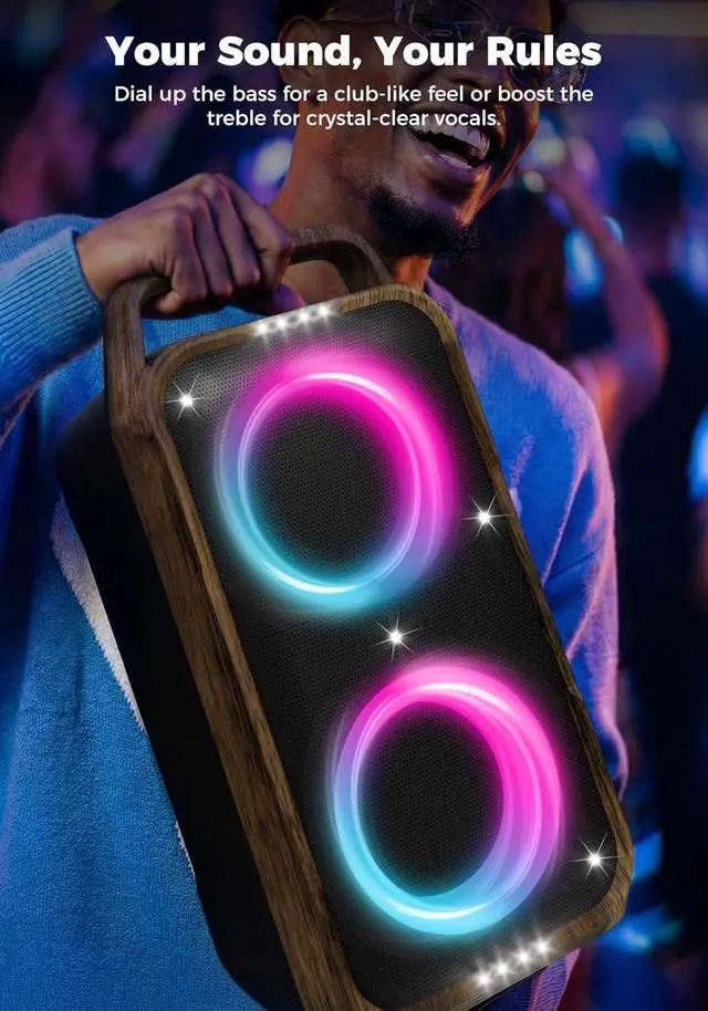 Fine-Tune Your Sound, Perfect Your Party: Take control of your music with customizable bass and treble settings. Whether you crave deep, thumping lows or crisp, clear highs, this speaker lets you tailor the sound to match your vibe.