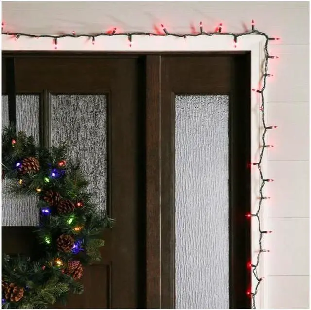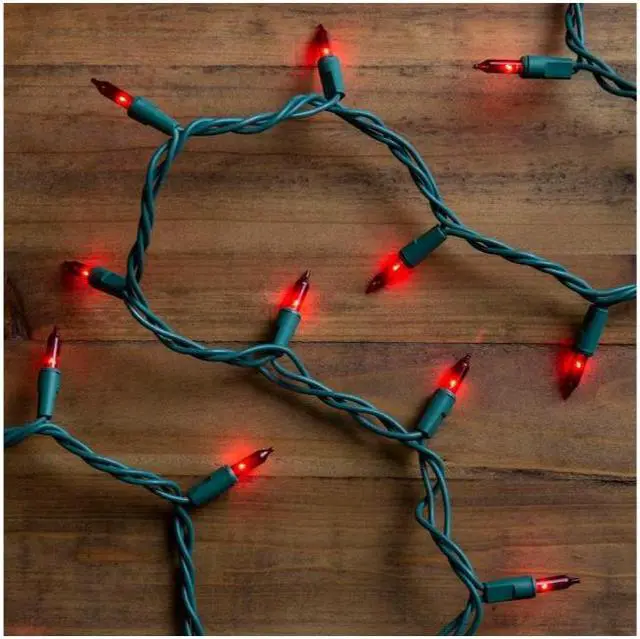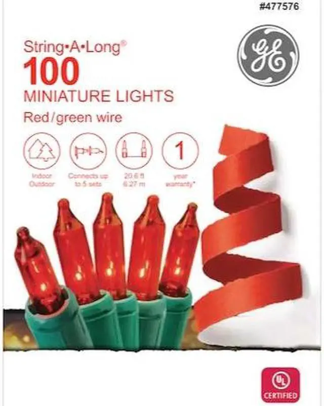 GE String-A-Long incandescent 5-mm miniature 100-count red light set. 3-Inch lead wire, 2.5 -inch lamp spacing, 3-inch end connector, 20.6 -feet lighted length, and green cord with fused plug.