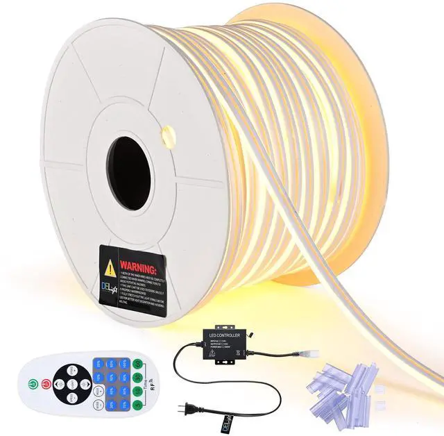 - Soft & Bendable Strip for DIY - 150 ft DELight 2-Sided Neon Rope Light with 120 pcs ultra-bright LED bulbs per meter, flexible to fit any corner well & design angled pattern or logo you like, or in continuous rows, perfect backlight for ceiling, window, door, garage, also ideal for restaurant, store, bar, party, Christmas