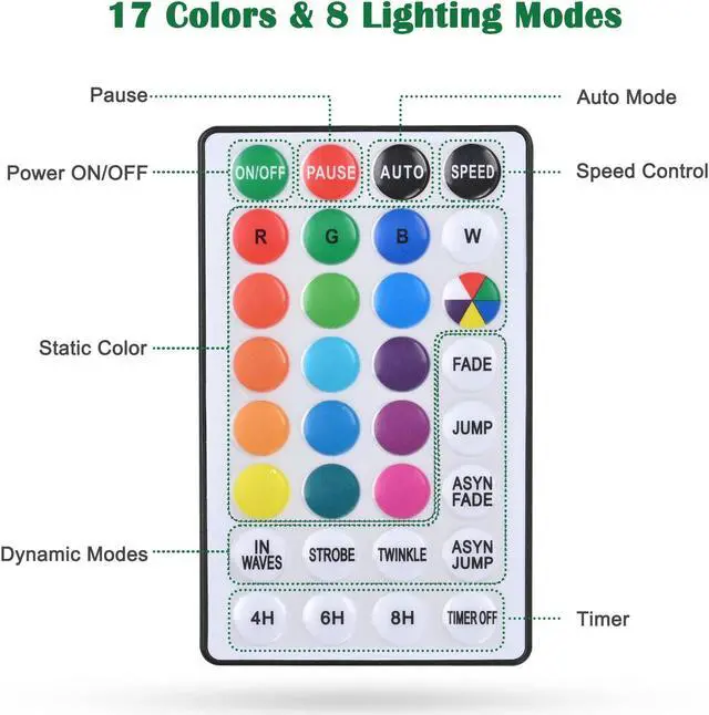 - 17 Colors & 8 Lighting Modes - 17 different static colors available for freely changing the color to match the holiday or event; 8 dynamic modes including Fade, Jump, Asyn Fade, Asyn Jump, Twinkle, Strobe, In Wave to create a cheerful party atmosphere; Press to set 4H, 6H or 8H timer to save energy