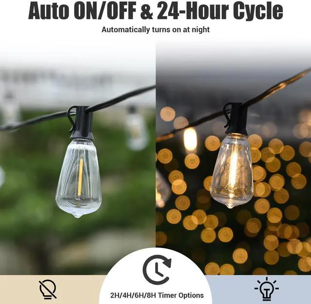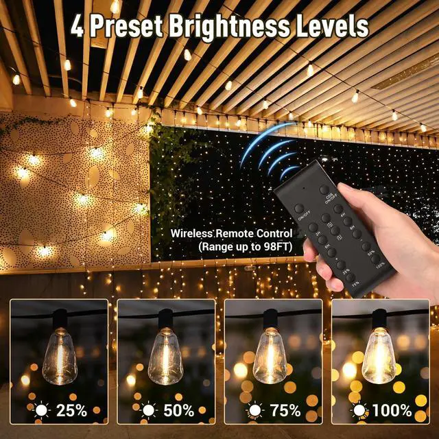 - 2-in-1 Dimmer & Timer - DELight Dimmer for Outdoor String Lights combines the functions of dimmer and timer for ease of use. It offers 4 preset brightness levels (25%-50%-75%-100%) and traditional timer options (2h, 4h, 6h, 8h) for ultimate control, saving time and creating stunning lighting effects