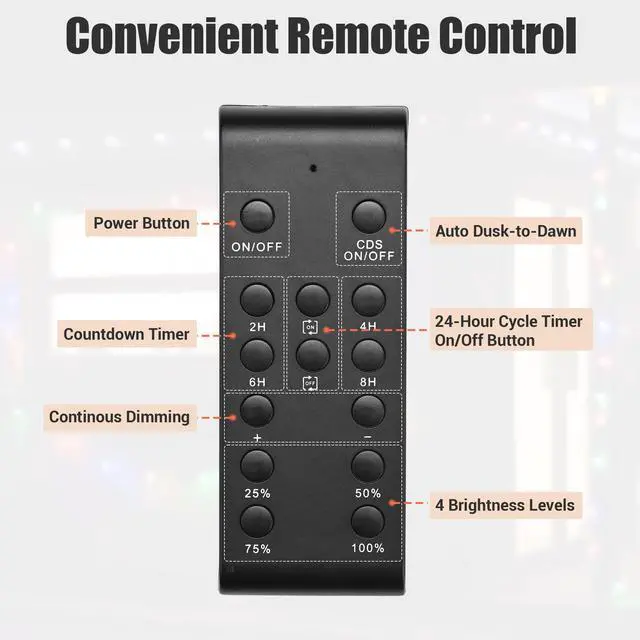 - 24-Hour Cycle - Program your lights to turn on and off at specific times each day with the convenient 24-hour cycle function. Create consistent ambiance to your needs without any manual adjustments