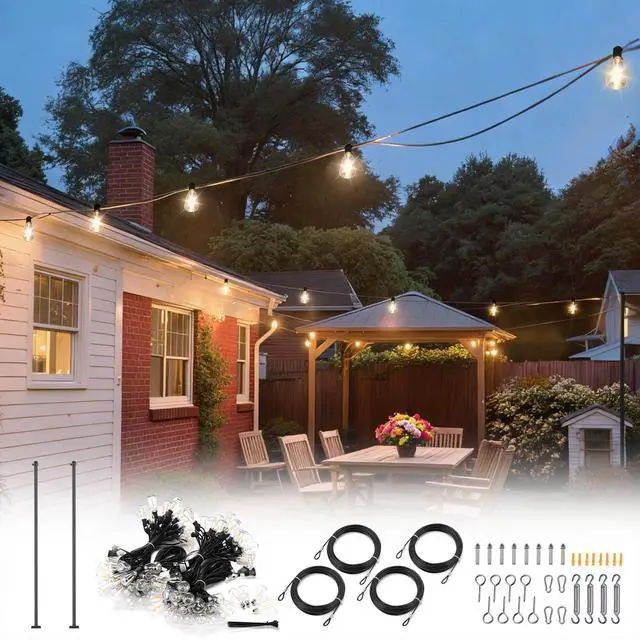 - DELight 200ft Outdoor Patio Lights Kit includes 4pcs festoon lights with 100 led bulbs+ 4 extra bulbs, 2pcs 10ft string light poles, 4pcs wire ropes, 8pcs eye hooks & anchors, 4pcs turnbuckles, and 4pcs carabiners. 100pcs vintage-style Edison bulbs cast warm, inviting glows throughout space, instantly creating a cozy, enchanting ambiance